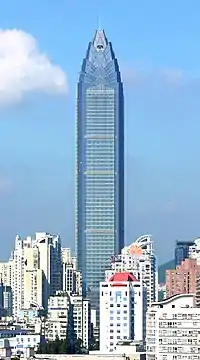 Wenzhou World Trade Center (Chinese: 温州世贸中心大厦) is a 68-floor supertall skyscraper in Wenzhou, Zhejiang, China. Construction of the building began on 9 June 2003 and was completed in 2010 at 333 m (1,093 ft), giving it the title of the 107th-tallest building in the world. It is located in the downtown area of Wenzhou where it stands as the tallest building in the city, the tallest in Zhejiang province and the 56th-tallest in China.