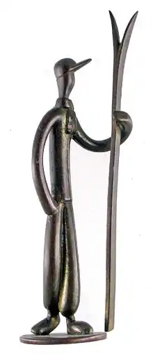 Karl Hagenauer was responsive to the change in public taste influenced by the popularity of the Vienna Secession. His stylized animals and whimsical creatures (reminiscent of Wiener Werkstätte designer Dagobert Peche) handcrafted in brass had broad appeal in domestic and American markets.[6] Some were useful, such as mirrors, cigar cutters, ashtrays,[7] cigarette stubbers - many in the form of athletes or animals, candlesticks, corkscrews, bookends, and lamp bases. Figurines, hood ornaments and other larger sculptures in wood and metal (such as the iconic Josephine Baker in the collection of the Casa Lis Art Nouveau and Art Deco Museum[8] in Salamanca) were purely decorative.[9]