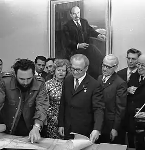Between January and July 1950 he attended a study course at the regional party academy at Schmerwitz, after which he was employed as an assistant at the academy till March 1951.[1] Further political education came with a period from August 1952 till August 1953 at the Komsomol (Young Communist League) Academy in Moscow.[1] During the 1950s he held a succession of senior positions in the permanent staff of the FDJ. Between 1953 and 1963 he was successively a member and party secretary for its central council, then its Agitation and Propaganda ("Agitprop") Secretary, and then its Culture Secretary.[1] Between 1955 and 1959 he also served as the FDJ's permanent representative from East Germany to the Central Council of the Budapest based World Federation of Democratic Youth, with which he would retain links throughout his subsequent career.[7] A significant aspect of Werner Lamberz's long career as an official with the FDJ was the close relationship it enabled him to form and sustain with the organisation's founder and constant supporter, the country's future leader, Erich Honecker, who himself headed up the FDJ's central council till 1955.[2]