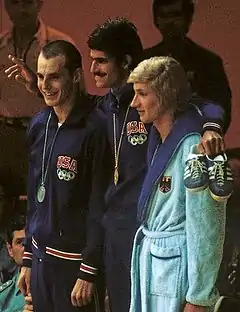 ![]() Steve Genter, Mark Spitz and Werner Lampe after winning the 200 m freestyle at the 1972 Olympics | ||||||||||||||||||||||||||||||||