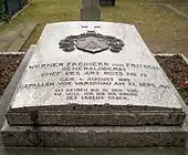 Just before the outbreak of World War II, Fritsch was recalled, and chose to personally inspect the front lines as the "Colonel-in-chief of the 12th Artillery Regiment"[21] during the invasion of Poland, a very unusual activity for someone of his rank. On 22 September 1939, in Praga during the Siege of Warsaw, a Polish bullet hit the General (either a machine gun or a sharpshooter) and tore an artery in his leg.[22] Lieutenant Rosenhagen, adjutant to Fritsch and an eyewitness to his death, wrote in his original, official report: