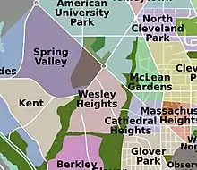 Wesley Heights is a small affluent neighborhood of Washington, D.C. situated south of Spring Valley.[1] Wesley Heights was founded in 1890 by a land speculation group led by John Waggaman and funded primarily by Charles C. Glover; Wesley Heights was further developed by the brothers William C. and Allison N. Miller during the 1920s.[1] Modern-day Wesley Heights is bordered by Massachusetts Avenue (on the east), Nebraska Avenue (on the north), Battery-Kemble Park (on the west) and Glover Parkway (on the south). Foxhall Road and New Mexico Avenue are the main roadway passing through Wesley Heights. To protect the character of the original historic housing design of Wesley Heights, the Wesley Heights Zoning Overlay was developed and approved by District of Columbia Zoning Commission on July 13, 1992, at the urging of the Wesley Heights Historical Society. Current homeowners and new housing development within the Wesley Heights overlay must meet specific building codes.[1] The Wesley overlay covers areas west of New Mexico Avenue (on the East), Nebraska Avenue (on the North), Battery-Kemble Park (on the West) and Glover Parkway (on the South). The overlay restriction does not cover development on housing located on the former Charles C. Glover country estate. Modern day Wesley Heights is located in Ward 3 Advisory Neighborhood Commission under 3D01.[2]