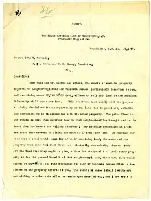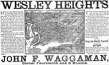 The area which became Wesley Heights was part of a tract of land owned by John Threlkeld (a resident of Georgetown). The tract of land was called Alliance.[3] In 1890, a group of investors fronted by John Waggaman (a real estate broker) and bankrolled by Charles. C. Glover bought all the land between Chain Bridge Road to the east, Newark Street to the North, 43rd Street (which then ran parallel to 44th street past Newark Street), and Fulton Street to the south.[1] Tunlaw Street (Now New Mexico Street) ran perpendicular between 44th street and 43rd street. The group named the new development Wesley Heights to appeal to Methodist buyers.[4] John Waggaman and Charles C. Glover played instrumental roles in the selection and purchase of the site of the soon to be Methodist-affiliated American University just north of Newark Street.[5]
