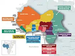 The West-Central Africa Division is divided into six Union Missions and four Union Conferences. Thes are divided into local Conferences, Missions and Regions.[2]