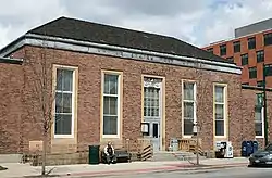 The post office was built by the Works Progress Administration of the New Deal[1] from 1939-40. The style is Stripped Classical, combining the massing and symmetry of Neoclassical style with some of the simplicity and anonymity of Moderne style. The building is two stories, brown brick walls sitting on a granite base, with a minimal cornice and a low hip roof. The front door and window openings are large, two stories tall, and arranged symmetrically, to perhaps suggest the grand portico of a Greek temple. Centered above the door is a sculpted eagle surrounded by stars. Inside, the walls are finished in marble wainscot and plaster. The lobby floor is beige terrazzo tiles with a red terrazzo border.[2]