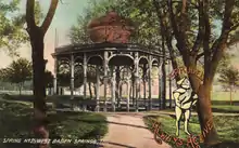 In 1887 the Monon Railroad built an extension of its line to transport guests to the hotels and springs at French Lick and West Baden, where the two sites competed to offer the best service, entertainment, food and mineral water.[15] By the late 1800s, guests arrived from across the country on seven separate railroads for relaxation and the alleged curative powers of the mineral water.[5] The area's mineral water and baths were alleged to cure more than fifty ailments.[15] Sidewalks led from the hotel to seven numbered springs, all of which were covered by open wooden shelters. West Baden marketed water from its onsite springs under the Sprudel Water brand name. (An gnome named Sprudel was also a part of its logo.) French Lick sold Pluto Water using a red devil as a part of its trademark.[16]