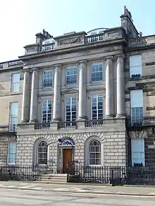 Randolph Place provides access from Melville Street into Charlotte Square and from there on to George Street in the New Town via two unassuming passages either side of the West Register House, constructed between 1811 and 1814. Robert Adam's original plan for the building included a grand rear entrance onto Randolph Place. However when the funds could not be found for Adam's design, architect Robert Reid was called in to modify the plan. The modified plan placed attenuated pavilions flanking a Diocletian window above a Venetian window at the rear of the building overlooking Randolph Place, and although architect David Bryce later drew up plans to add towers to the pavilions, this work was never carried out. Randolph Place therefore became a comparatively unimpressive entrance from the West End's Melville Street, into Charlotte Square.[27][28]