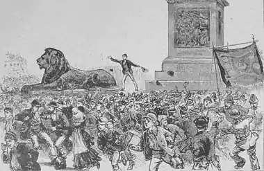 Feelings were further enflamed when Metropolitan Police officers pushed through the crowd to remove John Burns from the pedestal of Nelson's Column, from which he was trying to make a speech.[3] Questions were asked in the House of Lords on 18 and 25 February as to the police's handling of the events[4][5] and on the afternoon of 22 February the Home Secretary Hugh Childers accepted the resignation of Edmund Henderson, Commissioner of the Metropolitan Police.[6]
