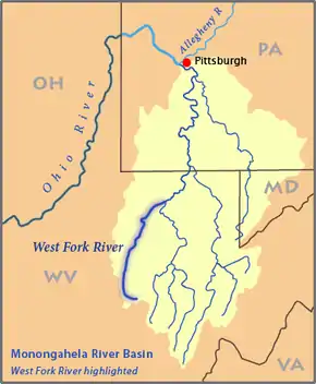 ![]() Map of the Monongahela River basin, with the West Fork River highlighted | |