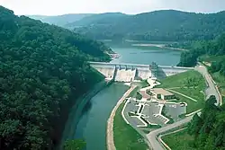 Three miles (four point eight kilometres) south of Weston, the river is dammed by the U.S. Army Corps of Engineers to form Stonewall Jackson Lake. The project was authorized by the federal Flood Control Act of 1966 for flood control, improvement of water quality and water supply, improvement of habitat for fish and wildlife, hydropower, and recreation.[12] Construction of the dam was delayed by the opposition of local residents[3] and began in the mid-1980s at an ultimate cost of $208 million;[12] it became fully operational in 1988.[13] The dam is 95 feet (29 m) tall and forms a 2,650-acre (1,070 ha) lake, with a larger capacity during periods of flood.[12] Land along the lake is leased as a wildlife management area[14] and Stonewall Jackson Lake State Park.[15]