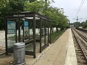 West Green is a station on the Green Line of the RTA Rapid Transit in Shaker Heights, Ohio. It is located at the western end of the parking lot of Green Road station, only 150 yards (140 m) west of Green Road platforms.