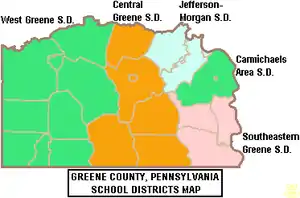 West Greene School District is a small, rural, public school district located in Greene County, Pennsylvania. The district serves a large rural region of approximately 256 square miles (660 km2). It includes Morris Township, Center Township, Gray Township, Jackson Township, Gilmore Township, Freeport Township, Springhill Township, Aleppo Township, and Richhill Township According to 2000 federal census data, it serves a resident population of 5,917. By 2010, the district's population declined to 5,102 people.[1] In 2009, the district residents' per capita income was $14,228, while the median family income was $35,149 a year.[2] The educational attainment levels for the population 25 and over were 83.7% high school graduates and 12.9% college graduates.[3]