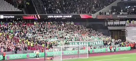 In the Round of 16 West Ham were drawn against Sevilla with the first leg to be played in Spain on 10 March 2022.[113] The night before the game, violence broke out between West Ham supporters and followers of Eintracht Frankfurt who were in the city for a Europa League game against Real Betis.[114] West Ham lost the first leg game 1–0 with Sevilla’s goal being scored by Munir.[115] A week later, West Ham won the second leg 2–0, in front of West Ham's biggest ever home support, thanks to a 39th minute header from Tomáš Souček and a 112th minute goal from Andriy Yarmolenko in extra time, Yarmolenko's second goal in as many games since returning to the West Ham side after being granted compassionate leave due to the Russian invasion of Ukraine.[116][117]