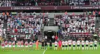 The first leg on 25 November contained considerable time-wasting by the Czechs including four times when the ball was kicked clean out of the ground. The match was decided in the second half by a 25-yard shot from full-back, John Bond, his first for three years and Alan Sealey, who scored after his shot had hit the post.[7] In the second leg, on 9 December 1964, Sissons put West Ham 3–0 up on aggregate only for Prague's Gustáv Mráz to score two late goals to finish the tie 3–2 in favour of West Ham.[7] The quarter-finals matched West Ham against Swiss side Lausanne. In the first leg in Switzerland, Brian Dear, playing in his first European game scored the first goal, Byrne the second before Lausanne scored in the 80th minute through Robert Hosp.[7] The second leg, described as a "thrilling cup-tie" took place at the Boleyn Ground on 23 March 1965. Two goals from Dear, one from Peters and an own goal from Lausanne's Ely Tacchella gave West Ham an aggregate 6–4 win. The Lausanne goals were scored by Pierre Kerkhoffs, Hertig and Norbert Eschmann.[7] The semi-finals saw West Ham play Spanish side Zaragoza. In the first leg in London, West Ham scored two first-half goals through Dear and Byrne. They attempted to defend their lead in the second half by playing nine in defence but conceded a 55th goal scored by Canário.[7] The second leg in Spain finished as a 1–1 draw with goals from Sissons and Zaragoza's Carlos Lapetra. Zaragoza were denied three penalty appeals and blamed the referee for their defeat.[8] The final against West German side 1860 Munich was played at Wembley on 19 May 1965 in front of 100,000 spectators. It has been described as "West Ham's greatest moment". Alan Sealey scored in the 69th and 71st minute, the first from an "impossible angle" and the second after Bobby Moore's free-kick was not cleared by the Munich defence.[8] Manager Greenwood, in his 1984 book Yours Sincerely, noted the significant roles played by Sealey, Dear and Bobby Moore in the final but also praised West Ham's defence, particularly the efforts of goalkeeper Jim Standen and defender Jack Burkett.[9]