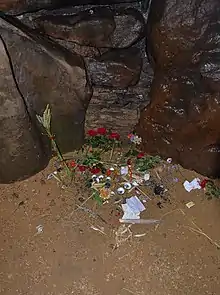 Many modern Pagans view West Kennet Long Barrow as a "temple" and use it for their rituals.[63] Some see it as a place of the ancestors where they can engage in "vision quests" and other neo-shamanic practices.[63] Others have seen it as a womb of the Great Goddess,[64] and as a sort of living entity.[62] The winter solstice has been a particularly popular occasion for Pagans to visit.[62] Modern Pagan visitors have often left items, including tea lights, incense, flowers, fruit, and coins, in the long barrow,[65] often regarding these as offerings to "spirits" which they believe reside there.[66] Various fires lit within the long barrow have left scorch marks and damaged the stones; one of the sarsens had to be glued back together after having been fractured by the impact of fire.[66] Some Pagans have advocated for all human remains found within the barrow to be re-buried within it, after which they believe the chamber should again be sealed.[67]