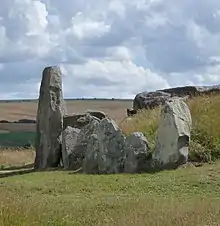 Across Western Europe, the Early Neolithic marked the first period in which humans built monumental structures in the landscape.[9] These structures included chambered long barrows, rectangular or oval earthen tumuli which had a chamber built into one end. Some of these chambers were constructed out of timber, although others were built using large stones, now known as "megaliths".[10] These long barrows often served as tombs, housing the physical remains of the dead within their chamber.[11] Individuals were rarely buried alone in the Early Neolithic, instead being interred in collective burials with other members of their community.[12] These chambered tombs were built all along the Western European seaboard during the Early Neolithic, from southeastern Spain up to southern Sweden, taking in most of the British Isles;[13] the architectural tradition was introduced to Britain from continental Europe in the first half of the fourth millennium BCE.[14] Although there are stone buildings—like Göbekli Tepe in modern Turkey—which predate them, the chambered long barrows constitute humanity's first widespread tradition of construction using stone.[15]