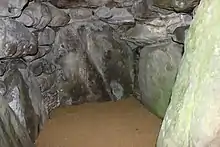 According to radiocarbon dating, a secondary phase of burial began in 3620–3240 calibrated BC (95% probability) and lasted until the second half of the third millennium calibrated BC.[36] This secondary stage therefore stretched over a period of centuries.[35] This in-fill was marked by sarsen slabs covering the original inhumations, followed by layers of chalk rubble, earth and sarsen, and both human and animal remains.[37] Many of these remains were of immature individuals; the south-east chamber for instance included the bodies of at least five infants.[38] It is possible that these human remains were collected together over a period of centuries outside the long barrow and only placed within it as part of a single event.[39]