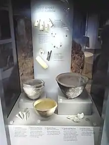 The secondary burial deposits also included artefacts alongside the human remains. Flint and bone tools were present.[37] Pottery included Grooved ware, Beaker ware, and all three styles of Peterborough ware: Ebbsfleet, Mortlake, and Fengate.[37] Collectively, this pottery came from at least 250 different vessels.[37] Pollard and Reynolds noted that "even at a conservative estimate", these ceramic sherds "could span a thousand years".[37]