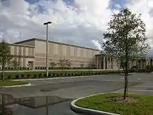 Among the school designs in Orange, Seminole, and Pasco Counties, there were a number of common design themes. These almost invariably included a rectangular front entrance portico and a circular drive for easier locating of school buses during dismissal at the end of the school day. The library was often an open, sunken design located in the center of the complex. Commons areas were spacious, had high ceilings, yet were inviting through the use of carpeting on the floors and walls. Lockers were in colorful yellows, blues, and reds. The band room walls were fully carpeted to dampen sound. Support columns and recessed door openings were both architecturally functional and stylistic.