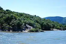 A little above Constitution Island, on the west bank of the river, is a steep, rocky, wooded hill 1,396 feet (426 m) high, known as Crow's Nest, and just above it is a prominent hill 1,340 feet (410 m) high known as Storm King Mountain.[3]