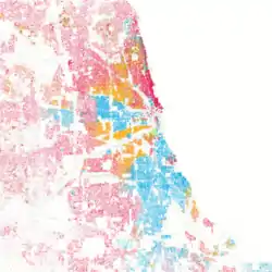 The Chicago West Side has gone through many transitions in its ethnic and socioeconomic makeup due to its historic role as a gateway for immigrants and migrants as well as its role for funneling poorer African-American residents away from the wealthier lakeside neighborhoods and central business district.[2] Today, the West Side consists of large mixed communities of middle class, working class, and low-income African American, Puerto Rican, and Mexican residents; some small communities of blue-collar, lower middle class and middle class white residents of historically Polish, Italian, Czech, Russian Jewish, and Greek, descent; and newer communities of middle-class, upper-middle class, and wealthy white residents created by gentrification.[3] Major shifts continue to happen due to forces such as rapid gentrification, selective corporate investments, and unequal distribution of city resources.[4][5]