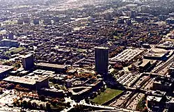 White flight and blockbusting drastically changed the demographics of the West Side by the 1950s. Throughout this decade, many white Chicagoans moved to the suburbs in a planned move by investors who, through scare tactics and instigating racial antagonism, encouraged white Chicagoans to sell their city homes and buy homes the investors built in the suburbs.[37] By 1960, Chicago recorded its first ever population drop. However, Black and Latino residents began filling the West Side to its maximum. Black areas of the West Side began to experience highly impoverished conditions moving into the 1960s. Many residents moved into housing projects that were built throughout the West Side the previous decade, the main housing projects being ABLA and Henry Horner Homes in the Near West Side, Rockwell Gardens and Harrison Courts in East Garfield Park, and Lawndale Gardens in Lawndale/Little Village. Many of these housing projects became predominantly Black and poor.[38] The Chicago Housing Authority was known for its segregationist policies and lack of building maintenance,[39] and police brutality was very frequent.[40] After the assassination of Martin Luther King Jr. on April 4, 1968, the Blacks of the West Side rebelled in anger against the oppressive system made more apparent by King's murder. Long stretches of businesses along Madison Street in Garfield Park and Austin and along Roosevelt Road in Lawndale, the majority of which were owned by whites, were looted and burned down. Mayor Daley ordered 10,500 police and 6,700 National Guardsmen into the West Side, ordering "to shoot to kill any arsonist or anyone with a Molotov cocktail in his hand... and... to shoot to maim or cripple anyone looting any stores in our city."[41]