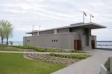 There are two facilities on the grounds of the West Side Rowing Club. The Doc Schabb Boathouse features an indoor rowing tank, ergometers and five bays of boat storage.[9] The Fontana Boathouse was built in 2007 and is the newest facility at the West Side complex, home to the Canisius Golden Griffins women's crew since 2011.[10] The design of the boathouse was adapted from plans by architect Frank Lloyd Wright for the Wisconsin Badgers Crew. When the University of Wisconsin–Madison suspended its football program in 1906 over safety concerns, plans for the boathouse were abandoned.[11] Wright's plans were later reintroduced at West Side and the boathouse was constructed, opening in 2007.[12]