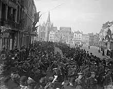 In June 1942, the regiment transferred to the Guards Armoured Division, landing with it in Normandy in June 1944 after on D-Day. It fought throughout the campaign in North West Europe with the division until the end of the war, including Operations Epsom, Goodwood, and Bluecoat in Normandy, the attempt to seize Arnhem bridge (Operation Market Garden), Operation Veritable in the Reichswald, and the crossing of the River Ems.[88][89][90] The division's published history always refers to the regiment as the West Somerset Yeomanry, which suggests that this was how they referred to themselves,[90] and the Commonwealth War Graves Commission records its casualties under '55 (West Somerset Yeomanry) Field Regt' rather than '55 (Wessex)'.[91]