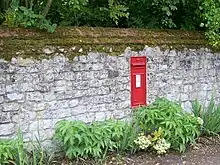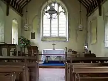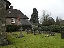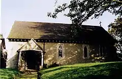 Adjacent to the Manor Farm is St Nicholas Church, small church dated to the late 12th century, which forms one of eleven churches in the Northanger benefice.[1] It fell into ruin and lost its roof before it was restored in the late Victorian period in 1888.[23] It is a single-cell building, with 2 small lancets on the north side, and contains windows dated to the 15th and 16th century.[23] The two doorways date to the 13th century, and the timber-framed porch on the south side to the 15th century.[23] The interior is described as "plain, with a piscina in the east wall and 2 in the nave, an octagonal font, and 3 wall monuments of the late 18th century."[23] The church became a listed building on 31 July 1963.[23]