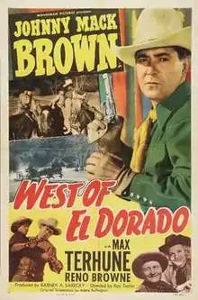 West of El Dorado is a 1949 American Western film directed by Ray Taylor and written by Adele Buffington. The film stars Johnny Mack Brown, Max Terhune, Reno Browne, Teddy Infuhr, Milburn Morante and Terry Frost. The film was released on June 5, 1949, by Monogram Pictures.[1][2][3]