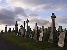 A notable feature in the area was the local cemetery located on high ground, which still serves the Cambuslang population to this day and has been extended several times.[13] It has records from 1889 although there are headstones on the site dating from the 1750s.[14] This was also the location of Old Cambuslang or Cambuslangtown, the hamlet from which the town took its name as it became larger – this settlement did not last beyond the 19th century.