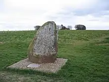 Although the horse is only presumed to commemorate King Alfred's victory at the Battle of Ethandun, an official monument to the victory was erected atop the hill, adjacent to Bratton Camp. The monument does not have an official name but is known as the Battle of Ethandun Memorial. It consists of a large sarsen stone (stone of remembrance) with a "pebbled" base, on which lies a metal commemorative plaque. The monument was unveiled 5 November 2000 by the 7th Marquess of Bath.[24]