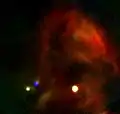 W40 lies in a molecular cloud with an estimated mass of 104 M☉.[4] The core of the molecular cloud has a shape like a shepherd's crook and is currently producing new stars.[23][24] The cluster of OB and pre–main-sequence (PMS) stars lies just eastward of the bend in this filament. The cloud core was also observed in radio light produced by CO, which allows the mass of the core to be estimated at 200–300 M☉. A weak, bipolar outflow of gas flows out of the core, likely driven by a young stellar object, with two lobes differing in velocity by 0.5 km/s.[25]