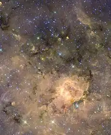 It is associated with a very massive complex of molecular clouds with a total mass of more than 7 million times the one of our Sun and is forming stars of all masses within star clusters that are less massive versions of those found on starburst galaxies;[4] it still has capacity to form more clusters.[5]