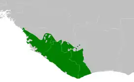 The ecoregion includes the lowland forests extending from the Atlantic Ocean a few hundred kilometres inland, and from western Côte d'Ivoire across Liberia, southeastern Guinea, most of Sierra Leone, and into southwest Guinea.