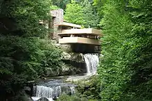 The Frank Lloyd Wright-designed Fallingwater house, perched over the Bear Run waterfall at Mill Run, Pennsylvania, is an internationally renowned architectural landmark. Fallingwater was entrusted to the Conservancy by Edgar Kaufmann jr. [sic] in Oct., 1963.[22] Included with this gift was the 1,543 acres of surrounding land known as Bear Run Nature Reserve, now expanded to more than 5,000 acres.[23] The Kaufmann family became acquainted with the Conservancy when they were involved with the early acquisition of Ferncliff Peninsula, later to become the cornerstone of Ohiopyle State Park.[24]