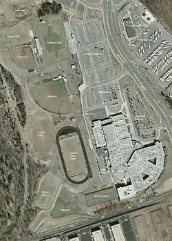 The school campus occupies 159 acres (0.64 km2) and is composed of the main building (the "school"), the sports complex including all fields, and the parking lots. The main building currently comprises two levels, with seven main hallways for the classrooms on each level. There are also 18 trailers located around the school. The hallways are listed alphabetically from A-G, and an additional hallway, "R" (for "renovation"), was added onto the school for use beginning in the 2006–07 school year.[33] The heart of the school is the library and media center which currently holds over 21,000 books with room for an additional 4,000. There are over 40 computer stations for student use in the library.