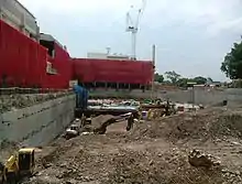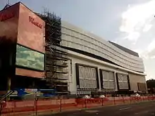 In early 2009, Sutherland Council approved plans to further upgrade the complex, which included demolition of the office tower and adding 100 additional speciality shops at a cost of $435 million. Myer lost its ground floor for a larger 'full-line' Woolworths supermarket.[17] The entrance has moved closer to the Kingsway and the centre expanded by approximately 19,000 square metres to 127,000 square metres of gross lettable area. Demolition of the areas around the office tower began in July 2013.[18] The star which sat on top of the tower was knocked off in late July 2013 as the office tower it sat upon was demolished. This caused anger amongst locals who wanted the star saved and incorporated into the new development.[19][20][17] However the fig tree located outside the centre on Kingsway was saved and incorporated into the development. This development did feature a new facade above the centre which is made up of grey wall which is designed to resemble fish scales in homage to "the Sutherland Shire's beach culture".[21]