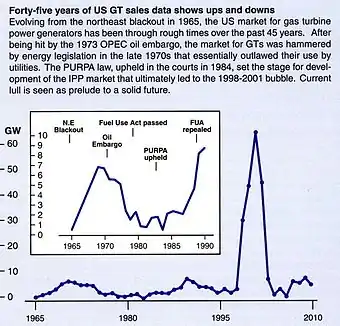 US gas turbine market from 1965 to 1990, with forecast to 2000, (at right) shows how the northeast blackout of 1965 accelerated the growth of electric utility market for gas turbines in the US. Later events, most notably the 1973 Arab Israeli war, followed by the 1974 OPEC oil embargo and the U.S. Fuel Use Act of 1978, caused a steep decline. A strong recovery followed with the rise of the Independent Power Producer ("IPP") cogeneration market under the Public Utility Regulatory Policy Act (PURPA), upheld by the US Supreme