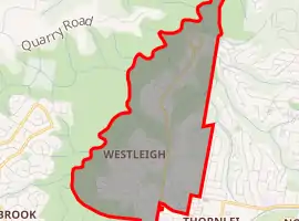 Westleigh derived its name from its location, directly west of Thornleigh. Development as a residential suburb began in 1967 and was marketed by Stewart Upton a large real estate firm following the subdivision of the area bounded by Duneba and Eucalyptus Drive, and the former riding school which was situated near Billarga Road. Prior to this time the area was rural with many citrus orchards, with a small number of homes on acreage along Quarter Sessions Rd, extending north towards the former sandstone quarry near "Blackfellow's Head", which was used as a dumping ground for stolen cars of the 1940s and 1950s. The area was originally heavily timbered, so many streets bear the names of Australian trees such as Stringybark Close, Spotted Gum Road, Eucalyptus Drive, Hibbertia Place, Peppermint Gum place and Ironbark Close.[2] Although the naming of the streets seems only vaguely related to what was there before houses arrived, and many streets named for plants contain not a single representative specimen. Westleigh was originally a housing estate west of Quarter Sessions Road. A small parcel of land was opened at the same time on the eastern side of Quarter Sessions Rd and this include Gum Blossom Drive and Bottle Brush Road. While classified as Thornleigh West for it postal address it was given a Westleigh address in the 1980s. This parcel of land was owned by a large home unit construction firm—RDC who built many project homes in Gum Blossom Drive. This company closed and the remaining land was sold to private parties in 1968.
