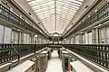 The interior consists of a main avenue 13 feet (4.0 m) on the ground floor, above which the second and third floor lanes are protected by richly decorated cast iron railings capped in mahogany. The skylit roof extends the length of the building, its ridgeline aligned at the Westminster end with the top of the triangular pediment. Emphasis in all of the building's construction was on the use of fireproof materials; granite, brick, and cast iron are all used, and the roof was made of tin.[7]