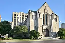 In the 1830s the Presbyterian Church nationally experienced a schism over its approach to the institution of slavery, and the Dayton congregation split into two churches.[2] The "New School" proponents, those who wanted the Presbyterian church to oppose slavery, left First Presbyterian and formed a new church, the Third Street Presbyterian Church, which was built at 3rd Street and Ludlow.[2] In 1919 the two churches merged into one and chose the name Westminster Presbyterian, with E. W. Clippinger, who had been minister at the Third Street church, leading the congregation.[2] In 1923 he was succeeded by Hugh Ivan Evans, the building was sold, plans were put in place to build a new church, and services moved to Memorial Hall, from where they were nationally broadcast.[2] In 1926 the new building was opened.[2]