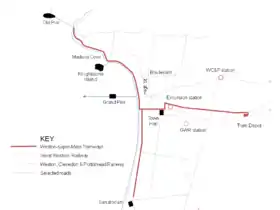 The junction gave access to the Locking Road branch. After running the length of Oxford Street to the Town Hall, the line turned left into Walliscote Road then right into Locking Road by the railway excursion station (the site of the present day Odeon cinema and Tesco supermarket).[11] The line continued eastward to the Ashcombe Road junction which was initially the terminus of passenger services. They were later extended a little further past the girls' school to the corner of Langport Road.[6] The line continued beyond here a short distance to the tram depot (now the site of a gymnasium) but this was only used by empty trams.[11]