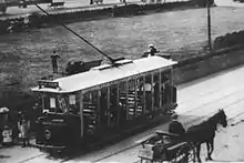 Also delivered in 1903 were 4 single-deck cars, which the driver again operated from an open platform. The sides of the cars were open but a red-and-white striped curtain could be let down in bad weather to give passengers some protection. 'Cross benches' were fitted right across the body for the passengers to sit upon, and a footboard was fitted along each side which the conductor walked on while the car was moving so that he could sell tickets. Two slightly larger single-deck cars were delivered in 1927.[14]