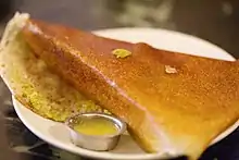 Wet grinding is rare in western cuisine but common in Indian cuisine. Wet grinders are used to make pastes from grains and lentils, such as those used in cooking dosas and idlis in South Indian cuisine.[1] These grinders generally consists of a few granite stone plates that are rolled against another stone plate with the items to be ground between them. Wet grinders have two advantages over electric mixers or blenders. First, the stone grinder generates less heat than a mixer; heat affects the flavor of the food. Second, the stones remain sharp for a greater time than do metal blades.