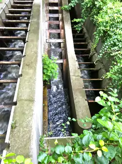 A sizeable herring run was an important food source for Weymouth's citizens as documented in town records as early as 1648.[8] At Iron Hill Park off Iron Hill Street, Whitman's Pond was dammed to turn the machines which processed the natural bog iron for the Weymouth Iron Works. Later, the Commonwealth of Massachusetts installed a herring ladder to allow the herring to bypass the dam on their spawning runs. Historically the herring ran to Whitman's Pond, and beyond up Mill River and Swamp River, to Great Pond.[8] River herring commonly refers to two species, Blueback herring (Alosa aestivalis) and alewife ((Alosa pseudoharengus)). Today, 1/2 million river herring and Rainbow smelt (Osmerus mordax) run up the river each year to spawn (although they are not able to ascend the fish ladders and only utilize the tidal portions of the river).[7][9][10]