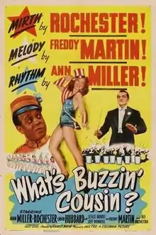 What's Buzzin', Cousin? is a 1943 American musical film directed by Charles Barton and written by Harry Sauber and John P. Medbury. The film stars Ann Miller, Eddie "Rochester" Anderson, John Hubbard, Freddy Martin, Leslie Brooks and Jeff Donnell. The film was released on July 8, 1943, by Columbia Pictures.[1][2][3]