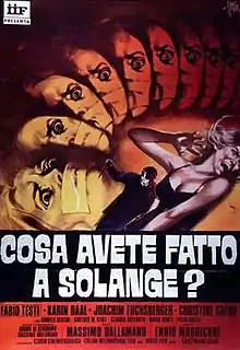 What Have You Done to Solange? (Italian: Cosa avete fatto a Solange?) is a 1972 giallo film directed by Massimo Dallamano, and starring Fabio Testi, Karin Baal, Joachim Fuchsberger, Cristina Galbó, and Camille Keaton. The plot follows a series of violent murders occurring at a Catholic girls' school in England where a young student has gone missing.