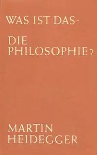 What Is Philosophy? (German: Was ist das - die Philosophie) is a book by the philosopher Martin Heidegger. It is the published version of a lecture course he gave at Cerisy-la-Salle in 1955.[1] It was translated into English by William Kluback and Jean T. Wilde.[2]