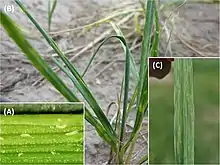 | (A) Wheat curl mite (WCM) on a wheat leaf; (B) leaf curls caused by WCM; and (C) WSMV symptoms on wheat leaf | |